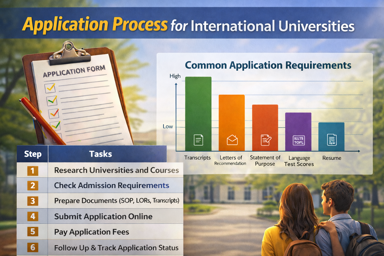 Students need SOP, LOR, academic transcripts, passport, language test scores, and financial proof.
